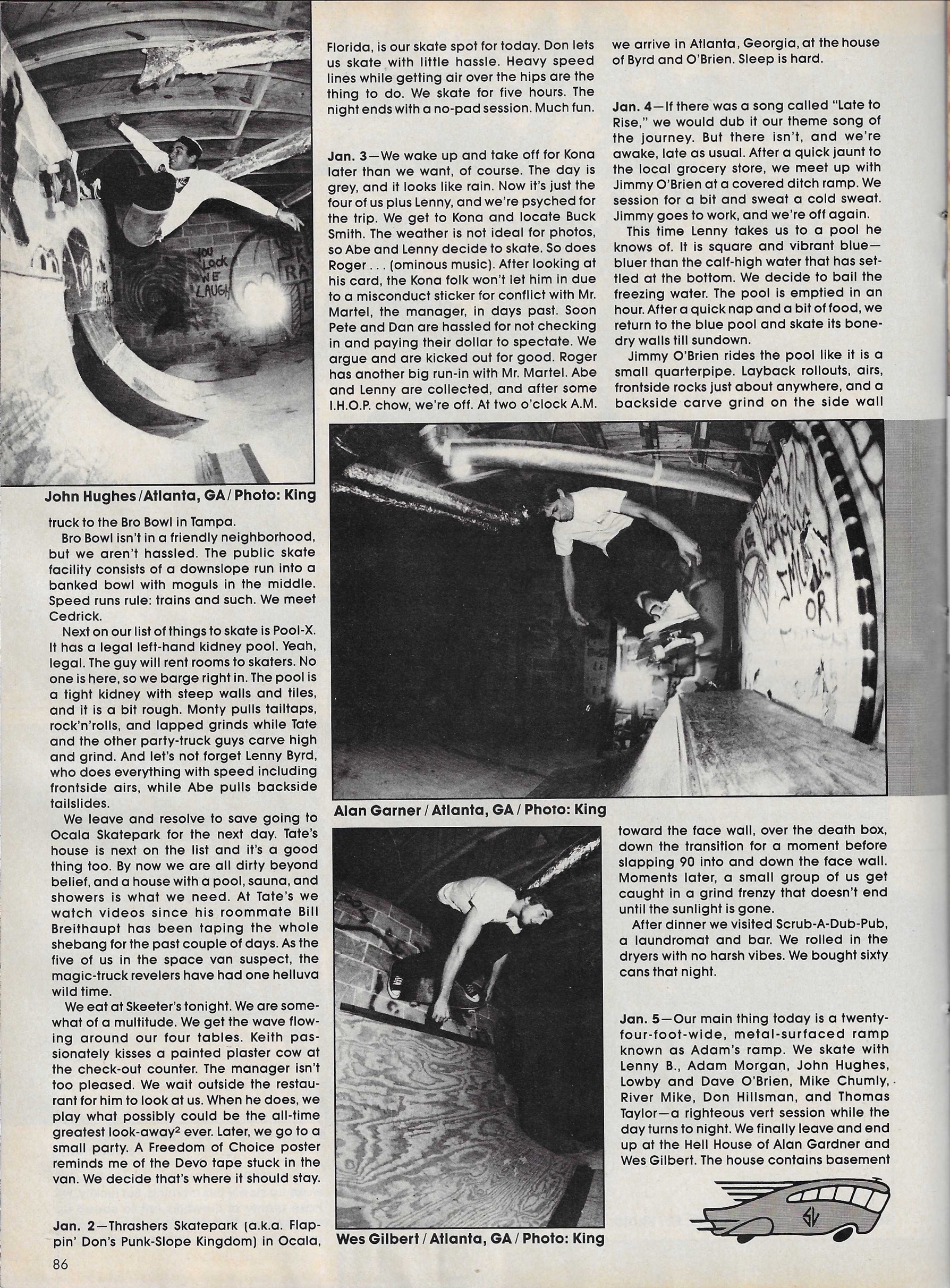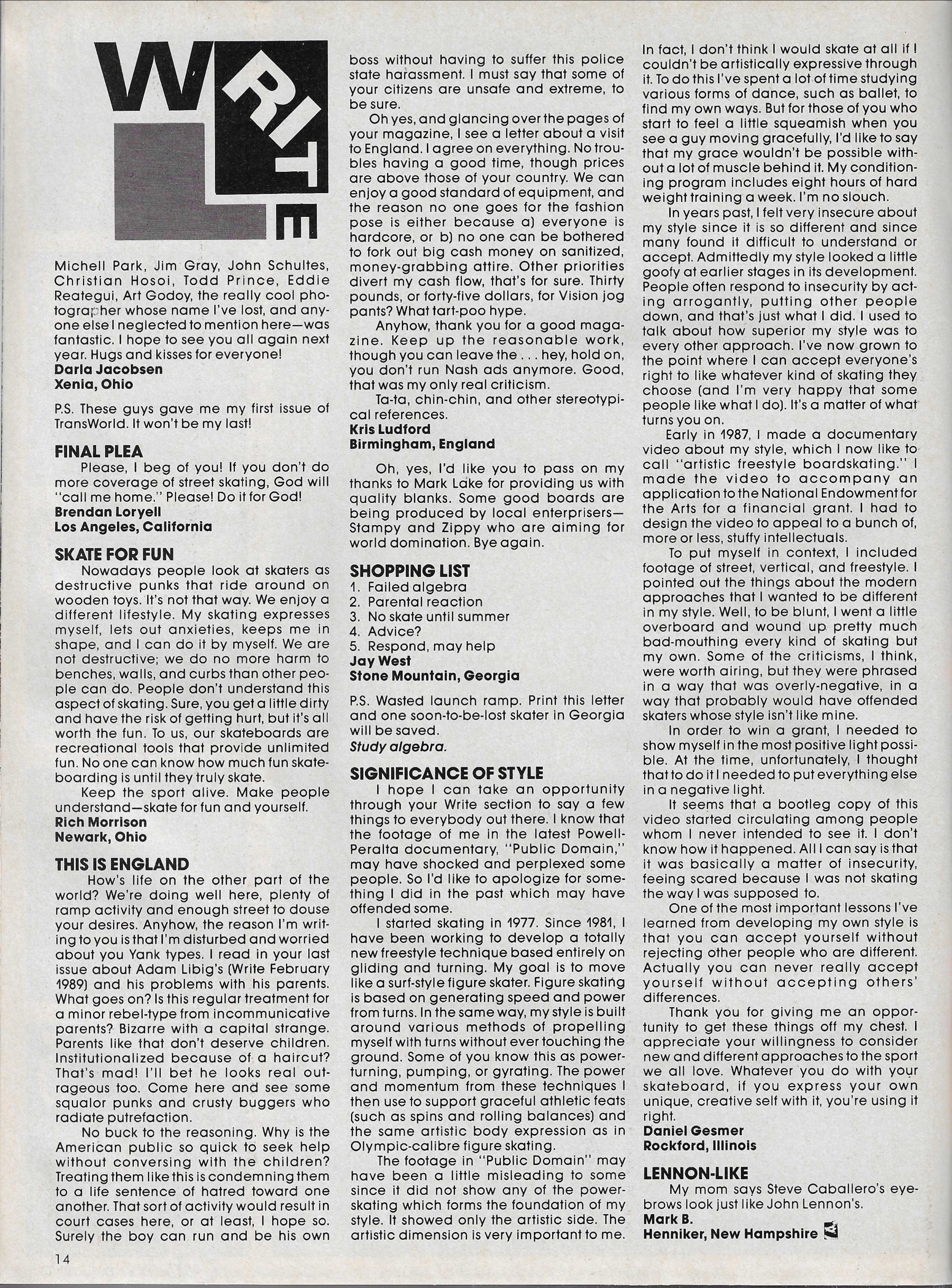 TWS August 1989 Publisher: TWS Skaters: Adam MorganAlan GardnerDave O BrienDon HillsmanJimmy O'BrienJohn HughesLenny ByrdMike ChumleyRiver MikeThomas TaylorWes Gilbert